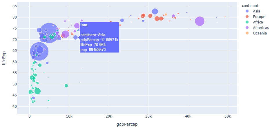 fig = px.scatter(data_frame=df[df['year'] == 2007], x='gdpPercap', y='lifeExp', color='continent', hover_name='country', size='pop', size_max=50)